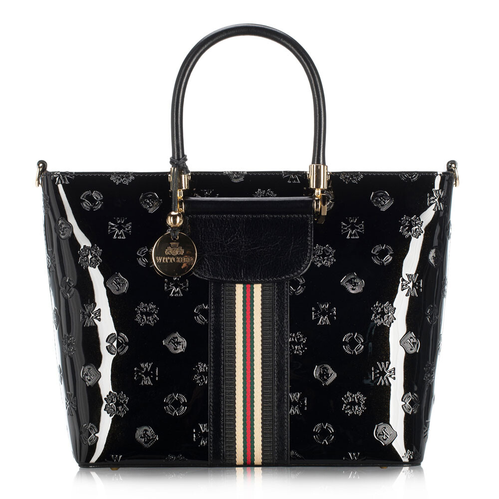 Torby ze skóry lakierowanej to klasyka, po którą od lat sięgają kobiety ceniące sobie elegancję. Pojemny model o klasycznym kształcie jest świetnym połączeniem ponadczasowej klasyki i nowoczesnego wzornictwa. Torebka została uszyta z czarnej, lakierowanej skóry o nienagannym połysku. Jej powierzchnię zdobi delikatny wzór, a front został dodatkowo wzbogacony o kolorowy lampas. Ten ostatni element idealnie wpisuje się w najświeższe, modowe trendy.