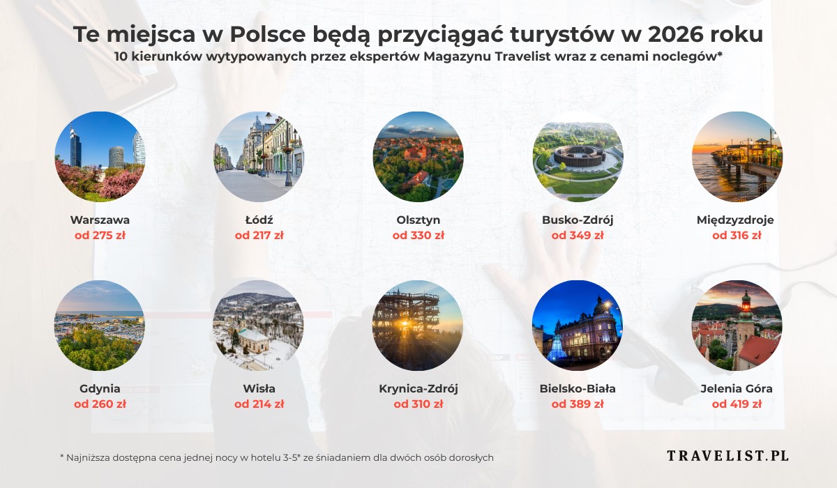 Eksperci Travelist podkreślają, że mimo rosnącego prestiżu i licznych inwestycji, Polska pozostaje atrakcyjna cenowo na tle Europy. Najtańsze pakiety hotelowe ze śniadaniem w Warszawie zaczynają się od 275 zł, w Łodzi od 217 zł, a w Olsztynie od 330 zł za noc dla dwóch osób. Nad Bałtykiem w Międzyzdrojach można znaleźć oferty od 316 zł, a w Gdyni od 260 zł. W górach Wisła kusi noclegami od 214 zł, Krynica-Zdrój od 310 zł, a Bielsko-Biała od 389 zł. Jelenia Góra, z nową ofertą rozrywkową, proponuje pobyty od 419 zł.