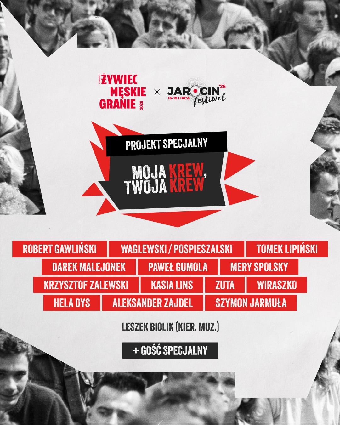 Podczas koncertów „Moja krew, Twoja krew” na Jarocin Festiwal 2026 oraz Żywiec Męskie Granie 2026, wystąpią: Robert Gawliński, Tomek Lipiński, Wojciech Waglewski, Darek Malejonek, Paweł Gumola, Mateusz Pospieszalski, Krzysztof Zalewski (Jarocin Festiwal + 21.08 Męskie Granie Warszawa), Mery Spolsky, Kasia Lins (tylko Jarocin Festiwal), Michał Wiraszko, Zuta, Hela Dys, Aleksander Zajdel, Szymon Jarmuła.