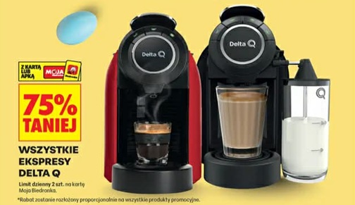 Największy hit nowej oferty Biedronki jest jednak inny. W czwartek do sklepów powróci promocja z 75-procentowym rabatem na wszystkie ekspresy do kawy Delta Q. Z gazetki Biedronki wynika, że uczestniczyć w niej będzie np. model Delta Qool Evolution, którego cena regularna na Biedronka Home to 379 zł. Po naliczeniu obniżki wyjdzie więc za 94,75 zł.